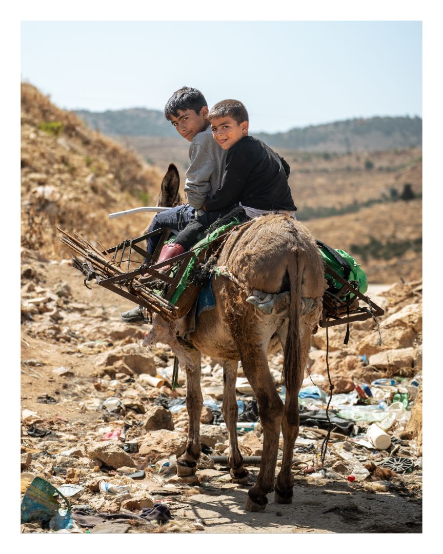 Palestinian boys ride their donkey through a garbage patch — the only route Israeli settlers have allowed for them to acces their land. Nahalin, Palestine, May 2025.